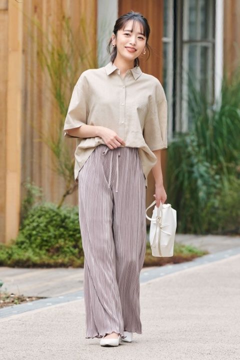 裤款采用了皱褶设计,配合笔直的轮廓和皱褶的垂直线条,能有效增强长腿的效果。加上裤款是宽松设计,配合光泽物料,穿起来较为清爽,是夏季必备的优雅裤款。