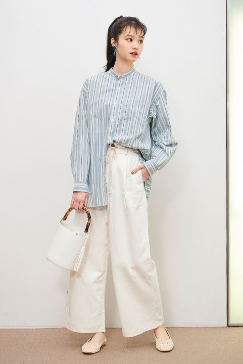 Light denim rope belt wide pants