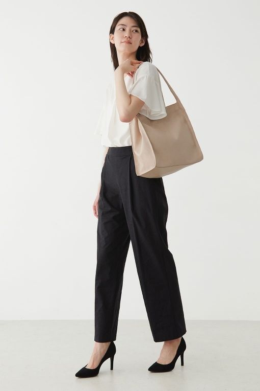 裤款采用了十分流行的亚麻混纺质地。配合直筒轮廓,及腰部的橡筋设计,穿起来十分舒适。