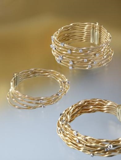 恍如穿越神秘沙丘,霎那间巧遇惊艳花丛。Marrakech Onde 副系列是 Marco Bicego 标志性 Marrakech系列的延伸,珠宝设计重新演绎经典的 18K 手织黄金弦线 「The coil工艺」, 打造出独特不规则的波浪椭圆形。变幻多姿的线条勾勒出层层沙丘,尽显神秘莫测的自然韵味;盈盈钻石与金色线条精巧交织,宛若绿洲间盛放朵朵闪耀之花,孕育出流光溢彩的手工技艺,映衬着女性时尚优雅的动人气质。涟漪线条在光影间自在流动,晶莹之花凝固生命的靓丽姿态,赋予日常别具一格的感官之美。